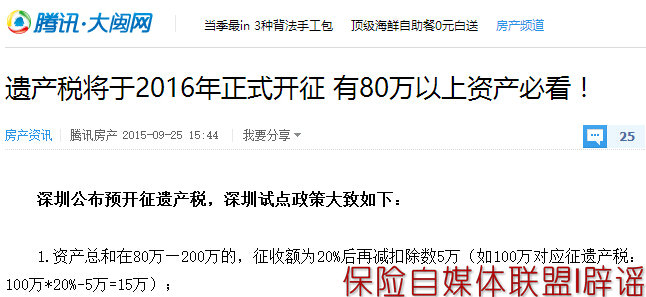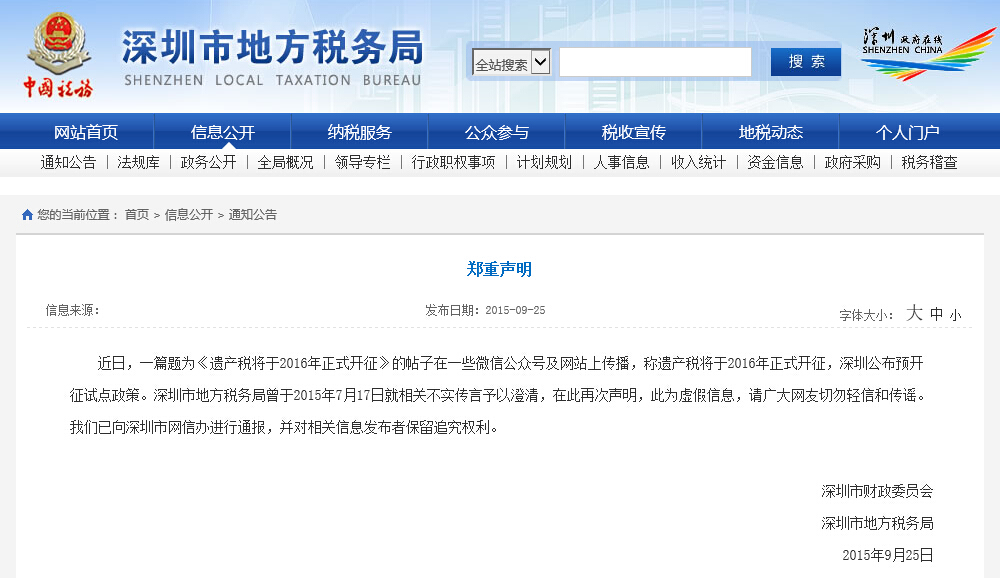 第1043期|事实派|编发/保险论坛 近日,一篇题为《遗产税将于2016年正式开征》的帖子在一些微信公众号及网站APP上传播,称遗产税将于2016年正式开征,深圳公布预开征试点政策。文章列举了详细的开征细则(实为多年前的草案,2004年拟定,2010年修订),引起广泛传播和关注。 关于遗产税,也并不是第一次传出试点、开征的消息了。此前2014年,我们就做过一期类似辟谣报道。11月13日上午,保险自媒体联盟分别致电深圳市地税局和税务热线,得到的答复是:没有相关文件!我们查阅深圳地税官网,发现早在9月25日,也就是开征遗产税消息传开之初。深圳地方税务局就进行了辟谣! 1深圳地税局:官网辟谣,保留追究权近日,一篇题为《遗产税将于2016年正式开征》的帖子在一些微信公众号及网站上传播,称遗产税将于2016年正式开征,深圳公布预开征试点政策。深圳市地方税务局曾于2015年7月17日就相关不实传言予以澄清,在此再次声明,此为虚假信息,请广大网友切勿轻信和传谣。我们已向深圳市网信办进行通报,并对相关信息发布者保留追究权利。- 深圳市财政委员会、深圳市地方税务局2015年9月25日 2深圳特区报:11月13日A7版辟谣近日,一篇题为《遗产税将于2016年正式开征》的帖子在一些微信公众号及网站上传播,称遗产税将于2016年正式开征,深圳公布预开征试点政策。深圳相关部门昨日表示,此为虚假信息,已多次澄清,请广大网友切勿轻信和传谣。《深圳特区报》2015年11月13日A7版 其实,早在1940年,南京国民党政府就曾经开征过遗产税(1938年颁布)。新中国成立后,关于开征遗产税的设想更是从未中断过: ►1950年:《全国税政实施要则》将遗产税暂定为拟开征的税种之一。 ►1993年:中共中央将“适时开征遗产税和赠与税”纳入建立社会主义市场经济体制的任务。 ►1994年:《工商税制改革的实施方案》将遗产税列为税制改革中可能开征的税种之一。 ►1996年:第八届全国人民代表大会第四次会议批准《中华人民共和国国民经济和社会发展“九五”计划和2010年远景目标纲要》:“逐步开征遗产和赠与税” ►1998年:《国务院办公厅关于印发国务院立法工作若干意见和1998年立法工作安排的通知》(国办发[1998]26号)将遗产税法列为“实践急需,但涉及问题比较复杂,现在就需要着手研究的法律、行政法规项目” ►1998年:《财政部对政协九届全国委员会第一次会议第1245号提案的答复》(财税政字[1998]161号):“现阶段在我国开征遗产税的条件已基本具备。按照国务院统一部署,我部会同有关部门已起草了遗产税条例,由于遗产税要由全国人大常委会审议通过并以法律的形式颁布,因而还需要经过一段立法审议的过程。” ►2000年:《中共中央关于制定国民经济和社会发展第十个五年计划的建议》(中发[2000]16号):“强化国家税收对收入分配的调节功能,完善个人所得税税法,开征遗产税” ►2001年:《中华人民共和国国民经济和社会发展第十个五年计划纲要》:“建立综合与分类相结合的个人所得税制度,适时开征社会保障税和遗产税” ►2013年:《国务院批转发展改革委等部门关于深化收入分配制度改革若干意见的通知》(国发[2013]6号):“研究在适当时期开征遗产税问题” ►2014年:新一轮税改(《深化财税体制改革总体方案》)重点锁定六大税种,包括增值税、消费税、资源税、环境保护税、房地产税、个人所得税。不含遗产税。 从历史经验看,人均GDP超过1万美元,人均年收入超过3000美元,是开征遗产税的门槛。根据我国目前的社会经济状况, 2014年我国人均GDP约为7485美元,开征遗产税的日子应该说不远了。而从国家的部署看,实行储蓄实名制、通过物权法、进行报税征收、开征房产税、个税调整,一系列动作都在为遗产税的推出做准备。(下文附:中国遗产税的历史与现状)而开征遗产税对于国家有以下3点好处: 调整社会财富分配。 调节消费、投资与储蓄之间的平衡。 能够鼓励参与慈善事业。 01、不动产及“传家宝”可采取遗嘱继承方式(指明由谁继承,做好公证,指定遗嘱执行人); 02、现金、存款的传承最好通过保险产品组合实现; 03、有价证券、银行理财产品等财富通过生前赠与过户最好;海外财产最好是设立境外信托; 04、企业财富的传承,则可通过完整的企业继任计划实现。 声明:本账号原创类刊文,转载时必须头部注明来源,具体请回复“公约”! |