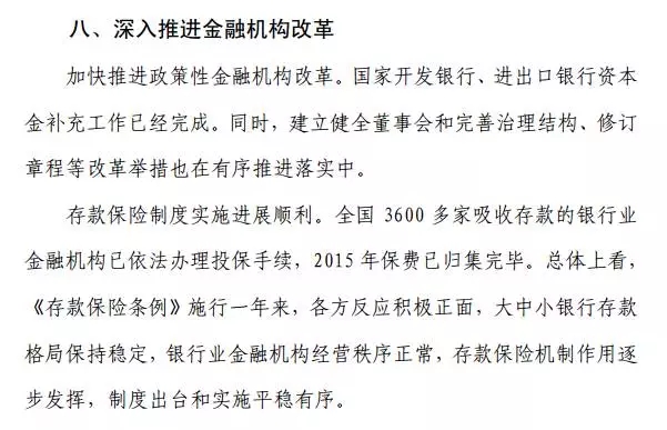 日前,央行发布了2016年第一季度《中国货币政策执行报告》,报告对2015年5月1日起施行的存款保险制度进展情况作了阐述。 此外,《中国金融》发表了于近日发布了中国人民银行金融稳定局局长宣昌能题为《中国存款保险制度的实施与展望》的文章,文里介绍了存款保险制度最新进展。 3658家: 截至2016年3月31日,全国3658家吸收存款的银行业金融机构已全部办理投保手续。包括全国性银行共21家,其中开发性和政策性银行3家、大型银行6家、股份制银行12家;地方法人银行业金融机构3637家。 70.8%: 截至目前,2015年保费全部归集完毕。主要有两个特点:第一,保费结构分布比较集中。大型银行和股份制银行交纳的保费相对较多,占投保机构保费总额的70.8%。第二,保费交纳对投保机构财务影响很小。以2014年投保机构经营数据计算,2015年5月至12月的应交保费折算成年度保费后占全部投保机构吸收存款总成本(包括利息支出与业务及管理费支出)、税前利润和营业成本的比例仅为0.33%、0.59%和0.40%。 0.5% 根据上述数据计算可以发现,0.5%的银行,贡献了70.8%的保费。 中国货币政策执行报告2016年1季度(截图) 当前,随着制度平稳运行,应尽早实施风险差别费率机制,进一步发挥存款保险强化约束和防范风险的作用。特别是,目前我国利率市场化改革已基本完成,抓紧实施基于风险的存款保险差别费率更加具有紧迫性。初步考虑,根据投保机构风险状况确定的风险评级、执行存款保险条例情况以及地方金融生态环境等因素实施差别化,在初始阶段总体费率水平保持基本稳定,以加强市场约束,促进投保机构审慎经营和稳健发展。 版权说明:本文档由用户提供并上传,收益归属内容提供方,若内容存在侵权,请进行举报或认领 存款保险时间轴 2014年10月,国务院常务会议审议通过“存款保险制度实施方案”。 2014年11月30日至12月30日,《存款保险条例(征求意见稿)》在中国政府法制信息网全文公布,面向社会公开征求意见。在充分吸收各方面意见建议的基础上,对《存款保险条例》做了进一步完善。 2015年3月20日,《国务院关于同意存款保险制度实施方案的批复》批复同意存款保险制度实施方案,明确存款保险基金管理工作由人民银行承担,要求人民银行会同有关部门认真组织实施。