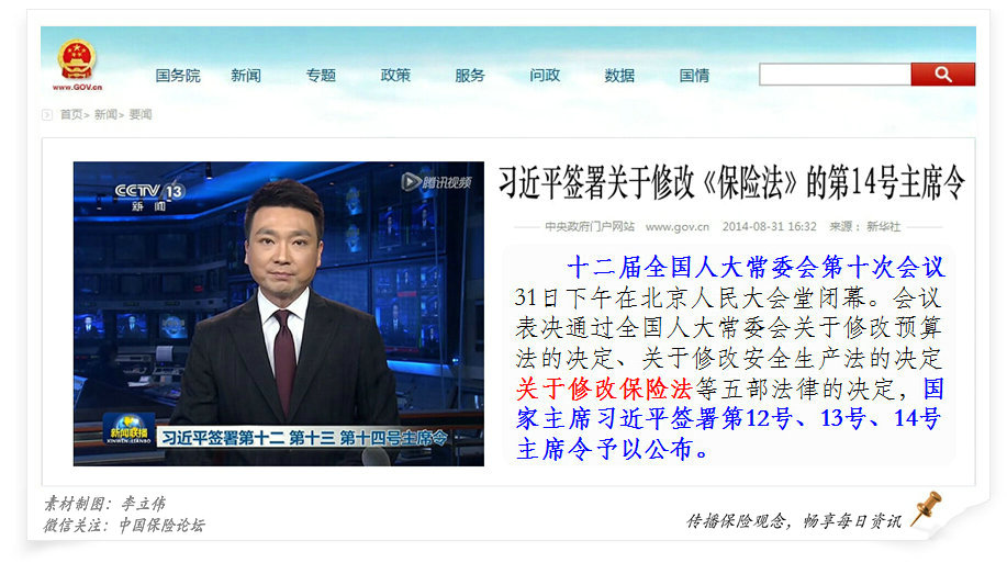 中国政府网消息:十二届全国人大常委会第十次会议31日表决通过了全国人大常委会关于修改保险法等五部法律的决定。国家主席习近平签署第14号主席令予以公布。 而在刚刚结束的8月,新“国十条”的“蝴蝶效应”正在显现,与之相关的各种政策也密集出台,迅速落地。保险业发展正式步入“加速”模式。 新国十条相关政策回顾: ●2014年07月9日:中国国务院总理李克强在北京主持召开国务院常务会议。会议部署五项措施以加快发展现代保险服务业。 ●2014年08月13日:《国务院关于加快发展现代保险服务业的若干意见》发布,以顶层设计形式明确了保险业地位。 ●2014年08月20日:国新办就加快发展现代保险服务业基本情况举行新闻发布会。国家发展和改革委员会秘书长李朴民、中国保险监督管理委员会副主席王祖继介绍加快发展现代保险服务业基本情况,并答记者问。 ●2014年08月27日:国务院总理李克强主持召开国务院常务会议,确定加快发展商业健康保险,助力医改、提高群众医疗保障水平。 ●2014年08月28日:发展改革委与保监会谈加快发展现代保险服务业,发展改革委财政金融司副司长徐晓波与保监会政策研究室主任熊志国作客中国政府网在线访谈,与网友在线交流,回答网友关心的问题。 ●2014年08月31日:十二届全国人大常委会第十次会议在北京闭幕。习近平签署第14号主席令,公布修改保险法决定。 《保险法》的前世今生: ●解放前:中国曾进行过一些保险的立法工作,由于政局不稳,没有相应的执行措施,所以大部分没有真正的实施。 ●1992年11月07日:第七届全国人民代表大会常务委员会第二十八次会议通过了《中华人民共和国海商法》,第一次法律的形式对海上保险做了明确规定。 ●1995年06月30日:第八届全国人民代表大会常务委员会第十四次会议通过了《保险法》,这是建国来中国的第一次保险基本法。是一部较为完整、系统的保险法律。 ●2002年10月28日:根据中国加入世贸组织的承诺,第九届全国人民代表大会常务委员会第三十次会议《关于修改〈中华人民共和国保险法〉的决定》,《保险法》做了首次修改,并于2003年1月1日起实施。 ●2009年02月28日:中华人民共和国第十一届全国人民代表大会常务委员会第七次会议对《保险法》做了再次修订。 ●2014年08月31日:习近平签署第14号主席令,公布修改保险法决定。《保险法》再一次被加以修改、完善,也充分体现出政府对保险业的高度关注。 |
